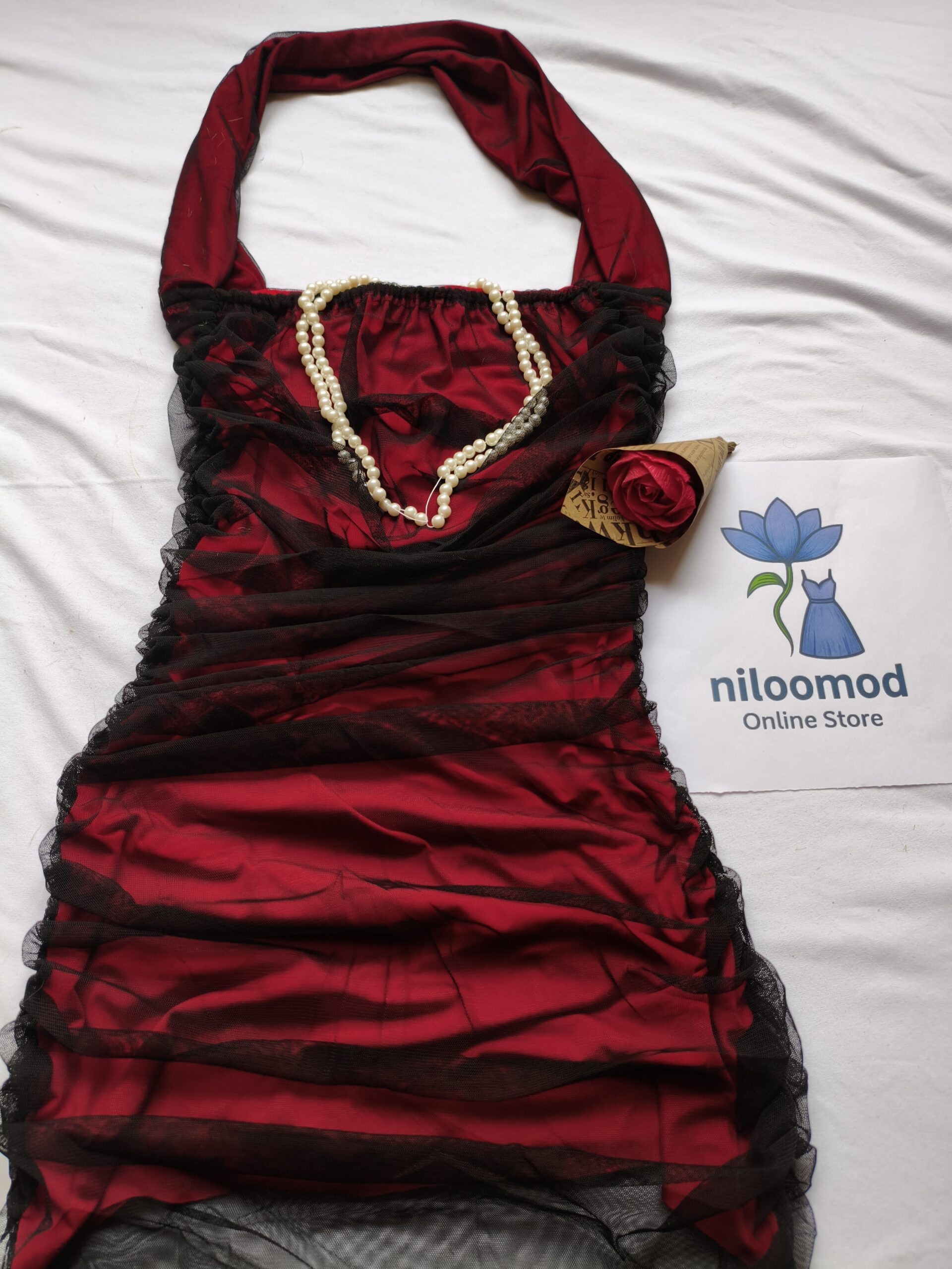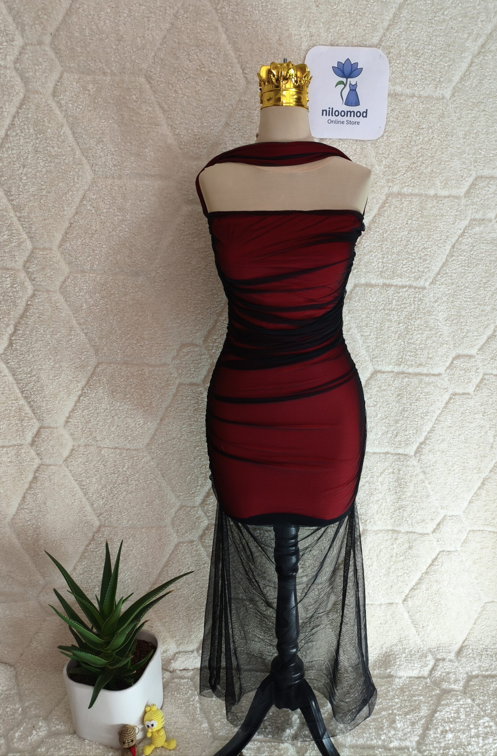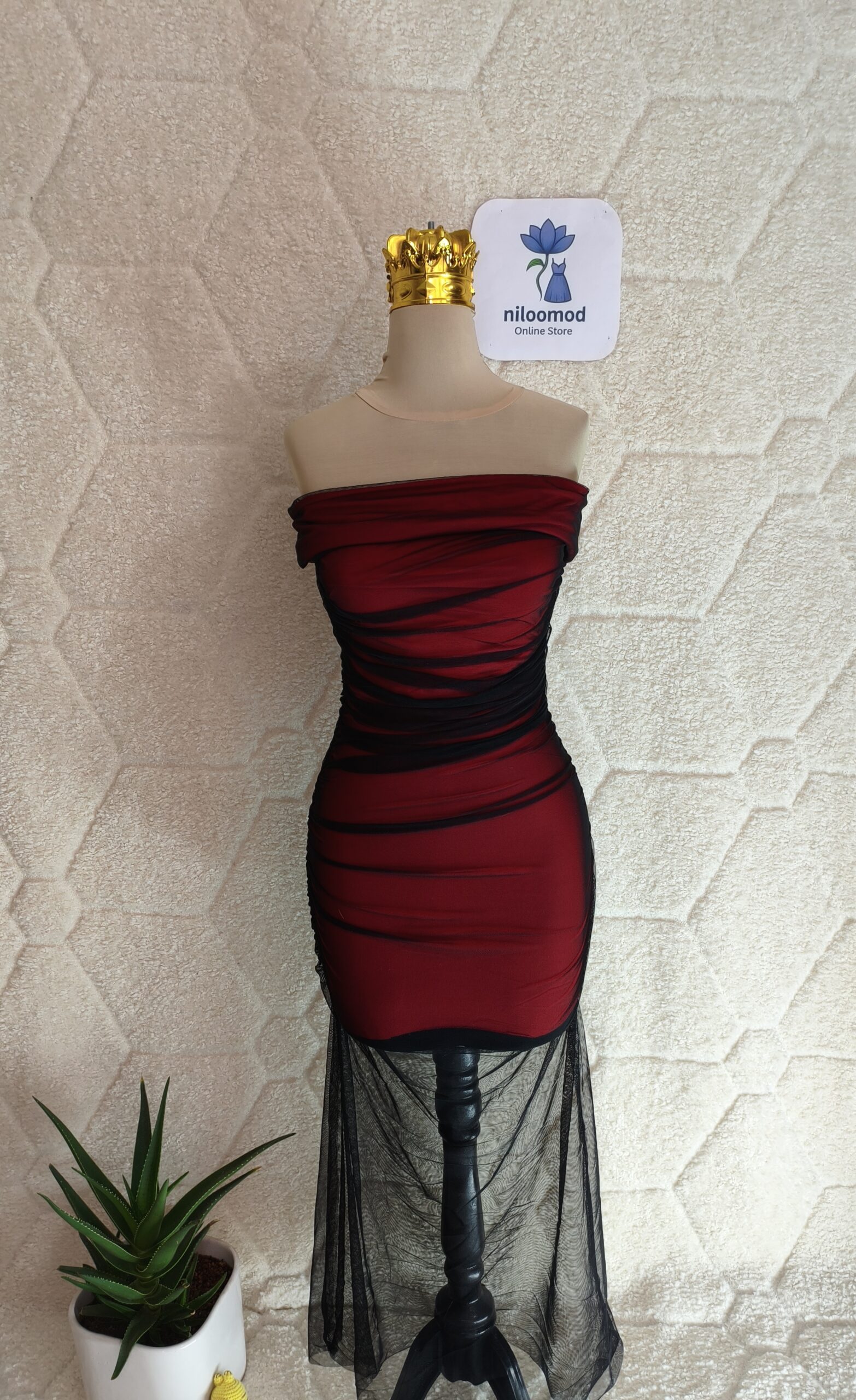 پیراهن زرشکی جذب با لایه تور مشکی با بند قابل جابجایی، طراحی چشمگیر وارداتی و فریبنده برای استایل شبهای خاص و لوکس.