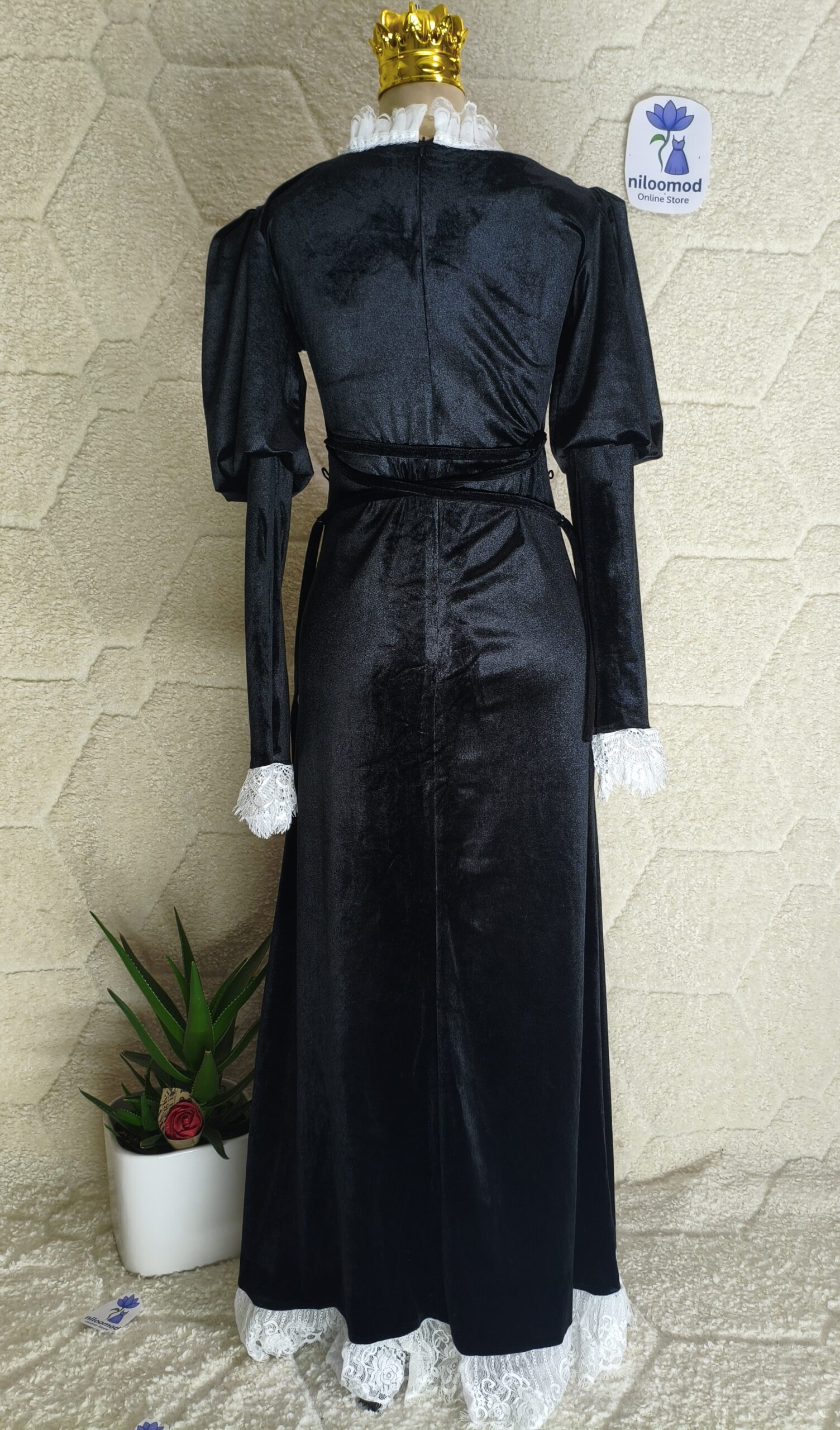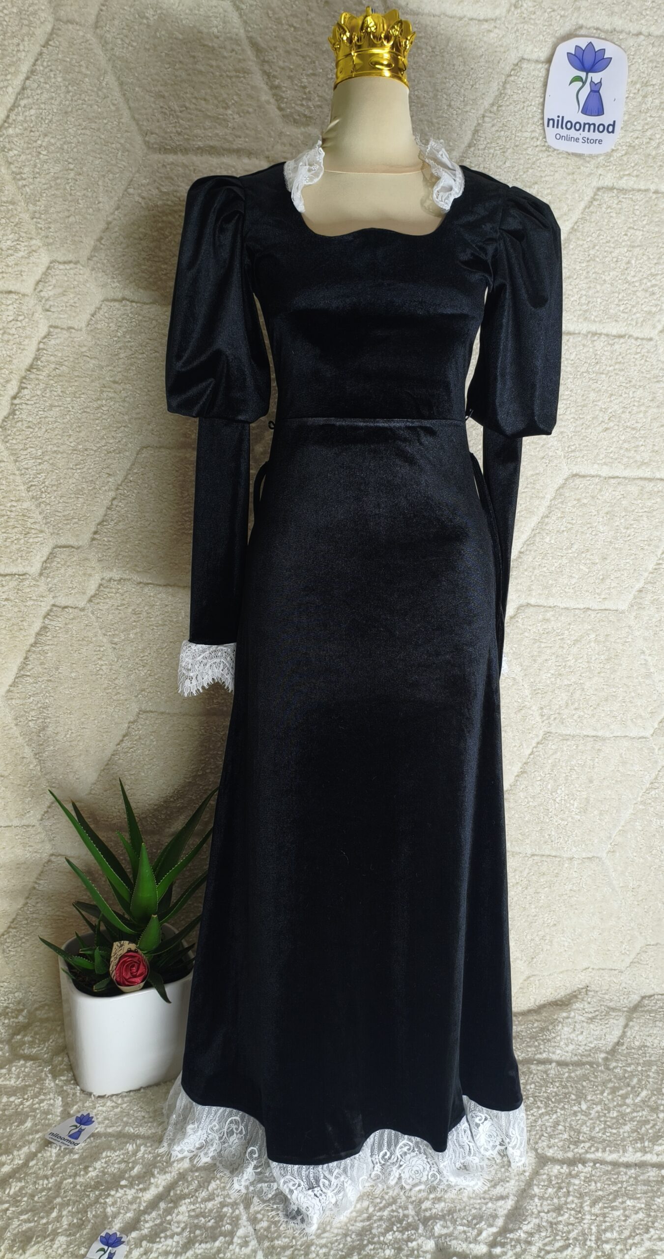 لباس مجلسی مشکی با پارچه مخمل لطیف و جزئیات گیپور سفید وارداتی؛ ترکیبی از ظرافت کلاسیک و استایل شیک شبانه.
