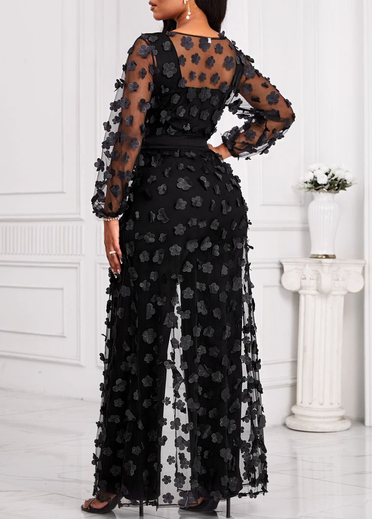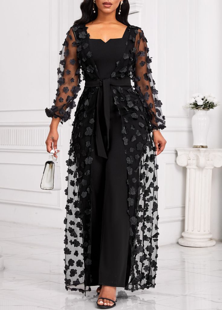 | 🧵 جنس شنل | تور مشکی با اپلیکه گلدار و کمربند پارچهای |