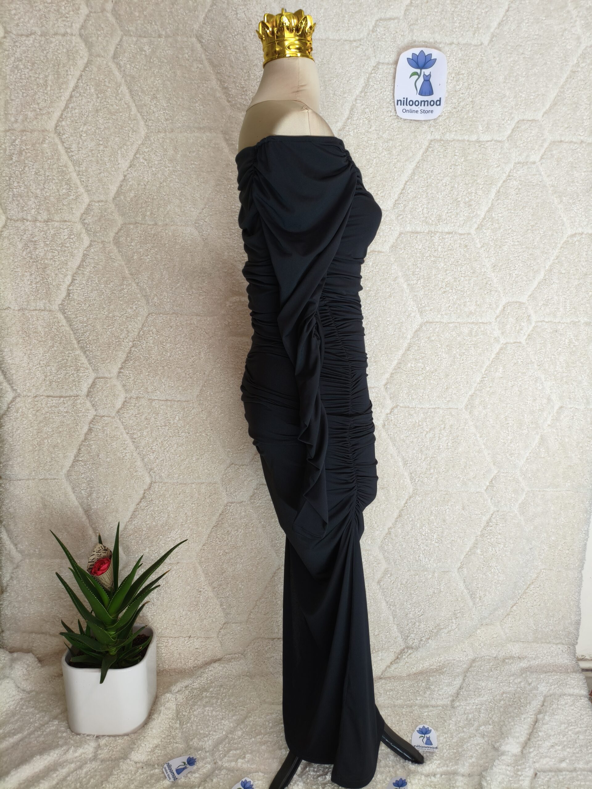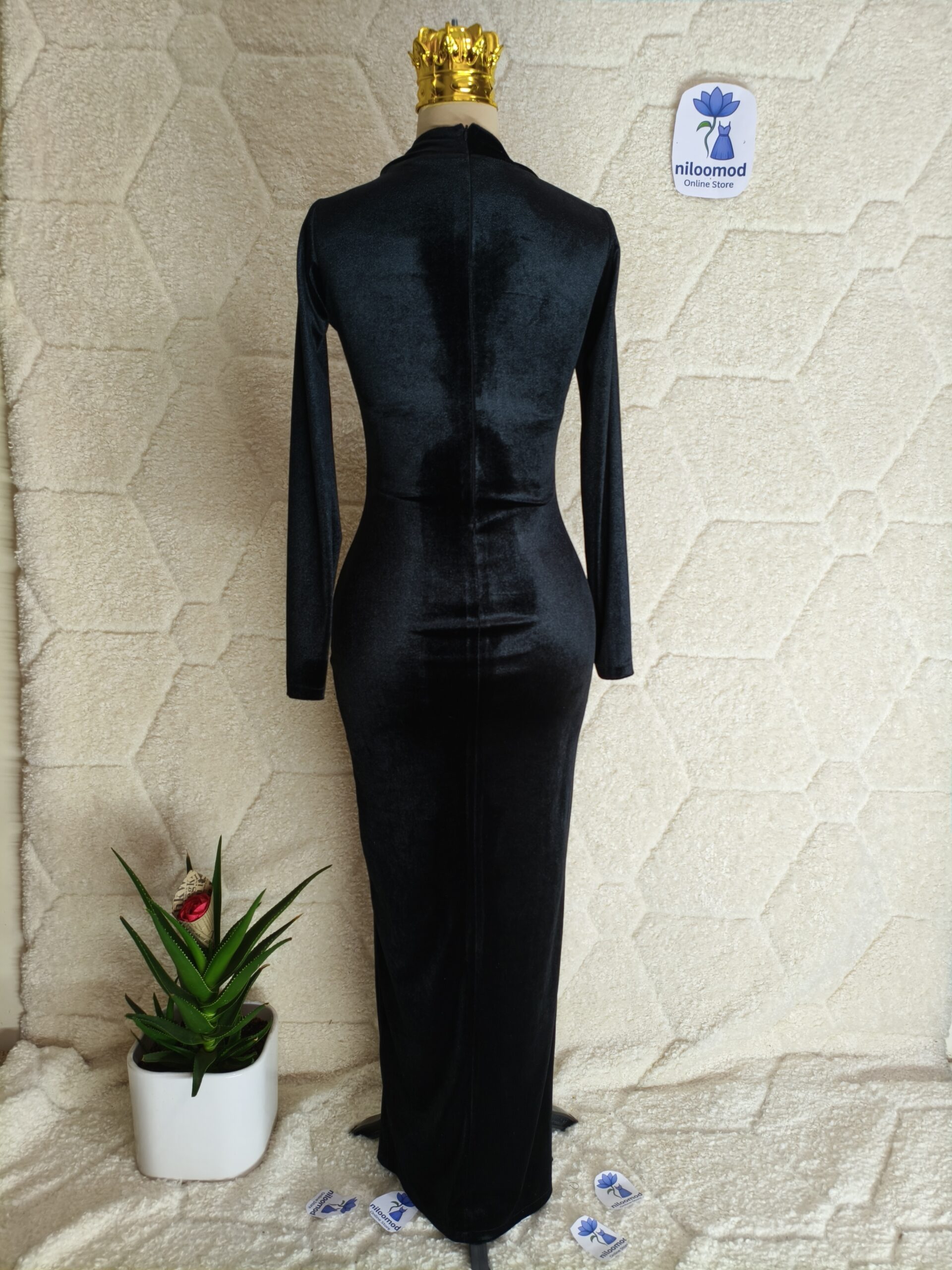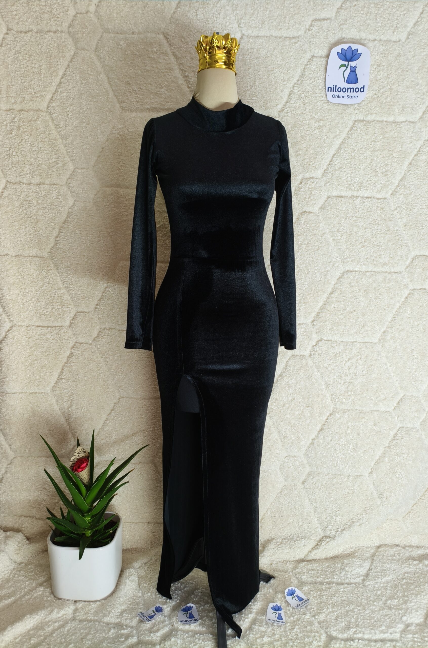 لباس شب مشکی وارداتی اندامی با دوخت ظریف و فرم شیک و یغه اسکی؛ مناسب مجالس رسمی و لاکچری.