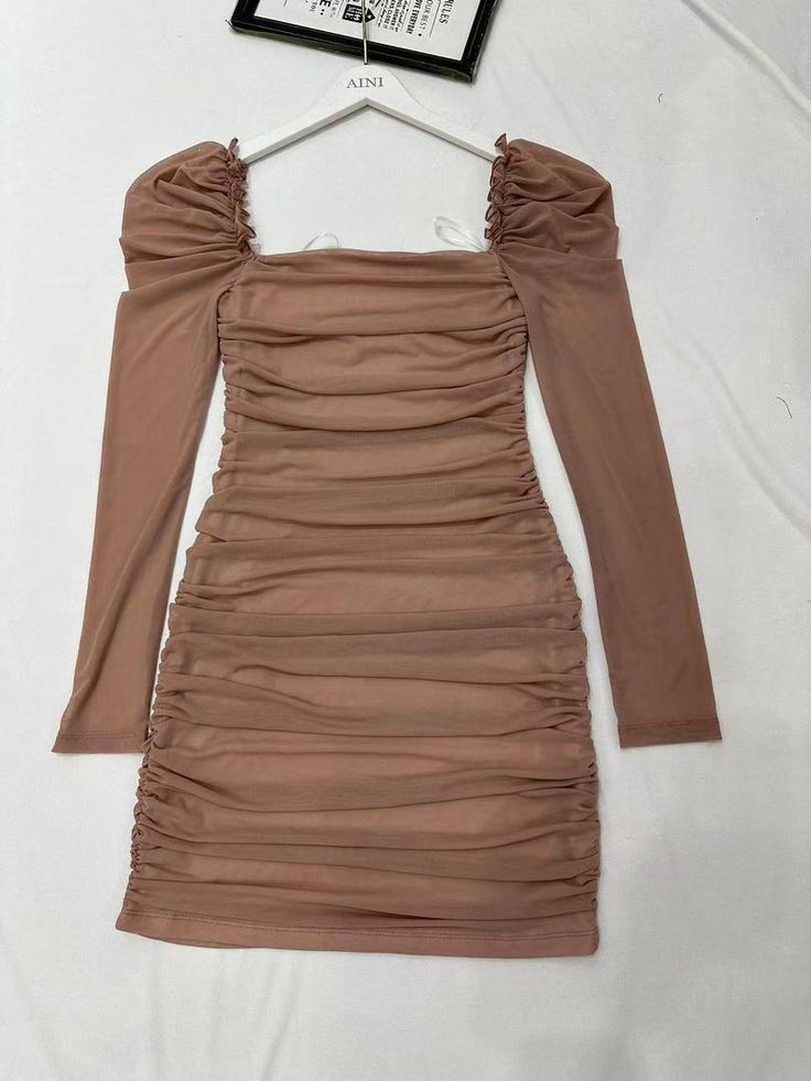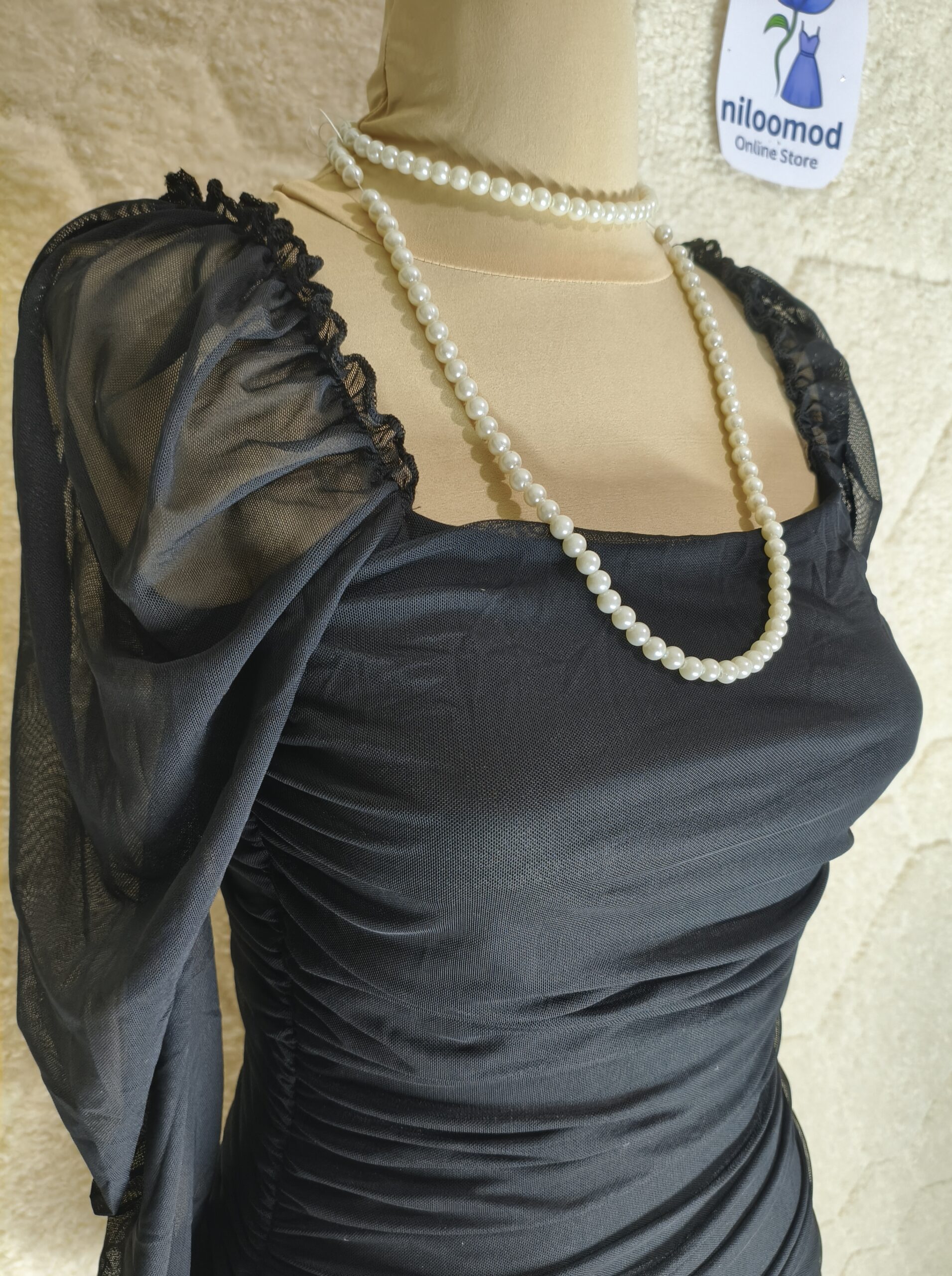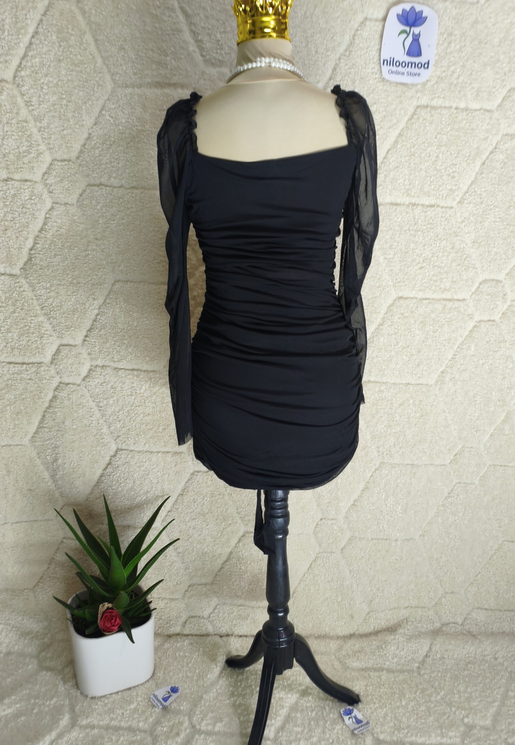 👗 مدل: مینی، جذب، آستین‌بلند تور، یقه مربعی، چین‌دار در قسمت تنه